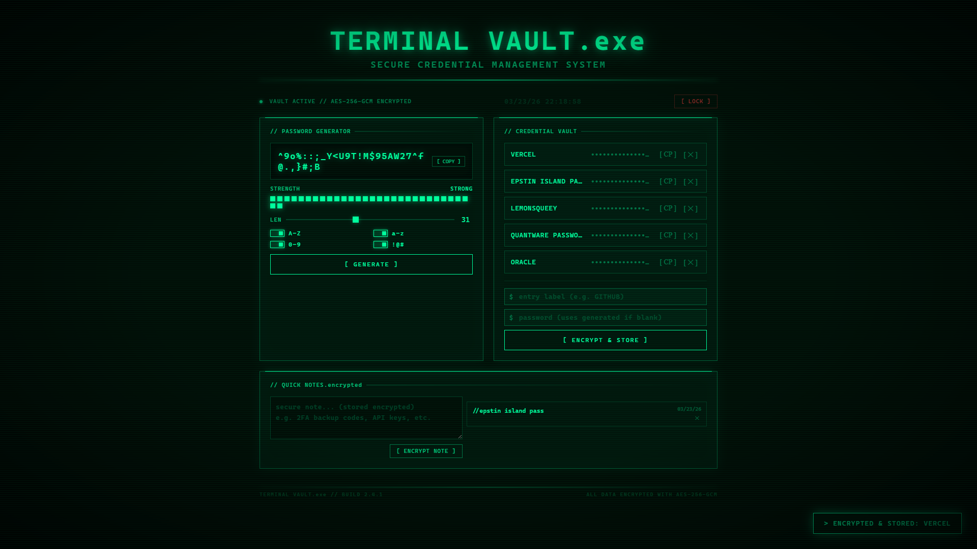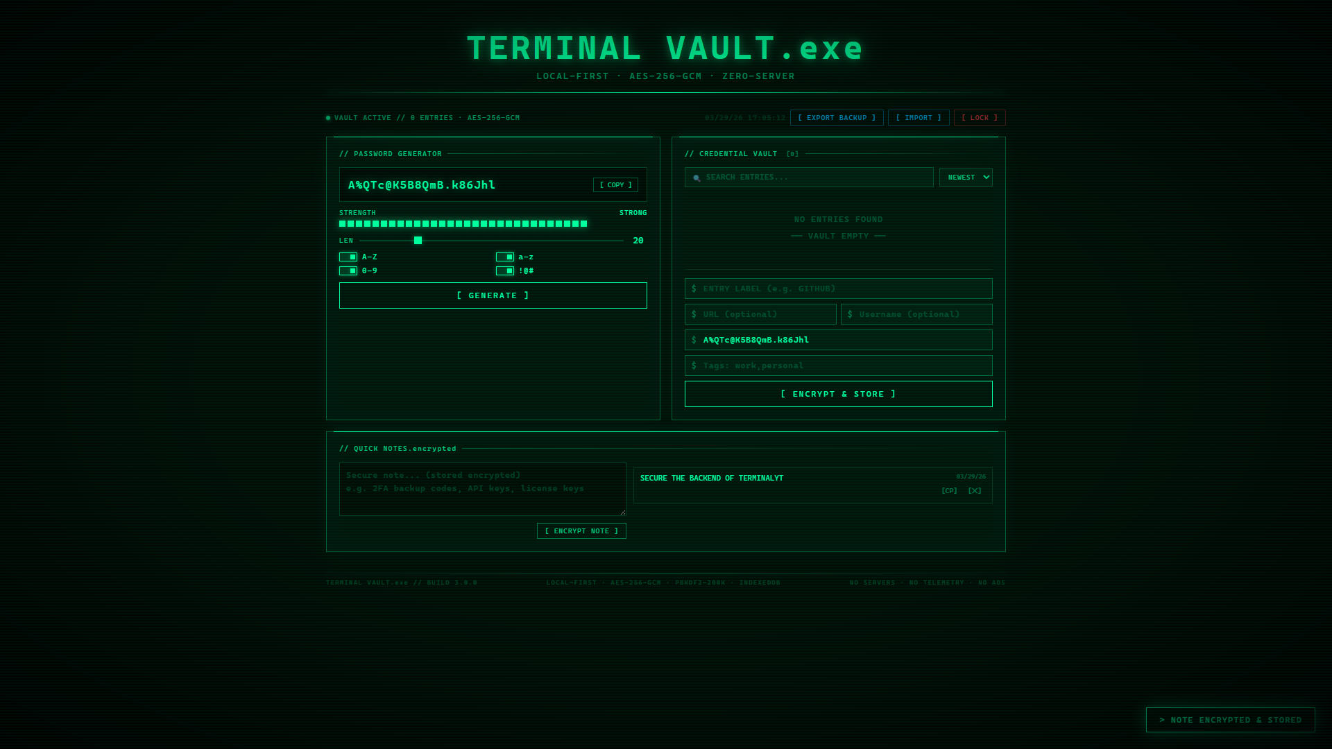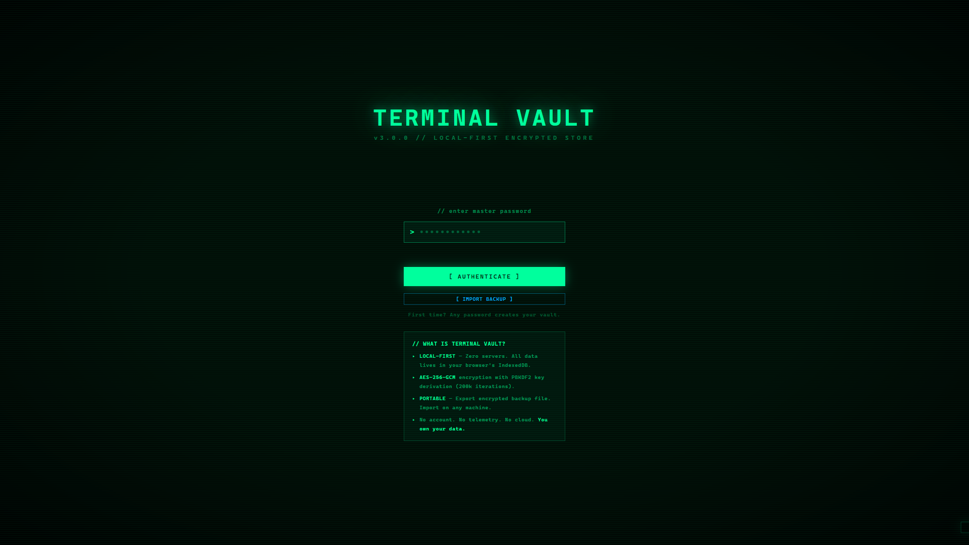 Terminal Vault is a fully local encrypted vault template that runs entirely in the browser using the Web Crypto API and IndexedDB.